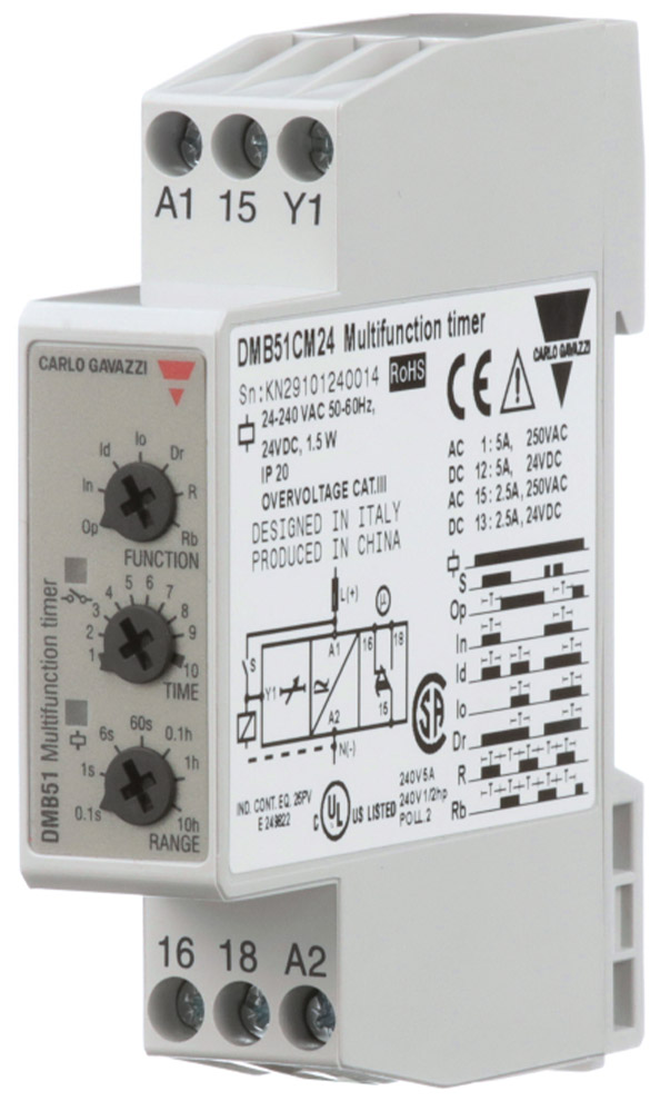 The Carlo Gavazzi FMB01DW24 multifunction timer has 7 knob-selectable functions and selectable time range from 0.05 seconds up to 300 hours.