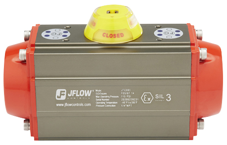 The JFlow Controls JFC Series pneumatic actuator is designed to operate in a variety of applications. The piston rack and pinion design features compact construction, symmetric mounting position, high-cycle life, and fast operation. Reverse rotation can be accomplished in the field by simply inverting the pistons. The single compact design uses identical body and end caps for both double acting and spring return models. This feature reduces inventory and allows field conversion by adding or removing modular spring cartridges.