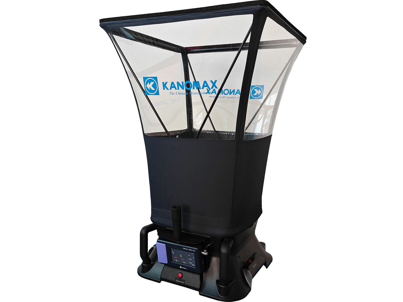 The Kanomax Model 6720 TABmaster Airflow Capture Hood includes an interchangeable hood to sample the air from any duct size. The unit is lightweight and easy to handle, and the full color screen can be tilted for optimal viewing angle at any height. The Model 6720 equips a removable handheld micromanometer with Bluetooth wireless capability.