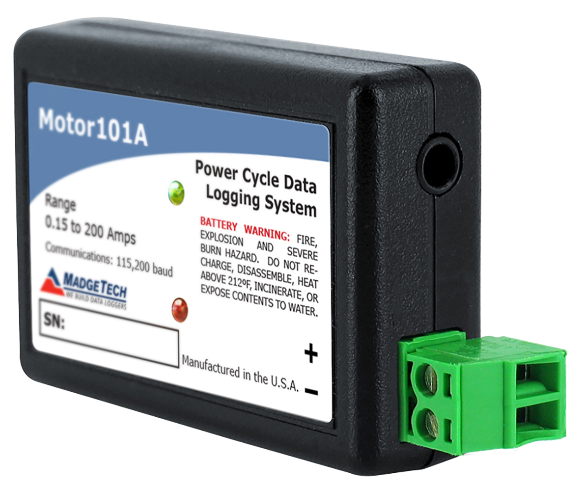 The MadgeTech Motor101A data logging system measures and records on and off status changes for motors or other equipment drawing up to 200 Amps. The state change occurs when the current switch exceeds the 150mA set point. This allows for most basic equipment to be monitored.