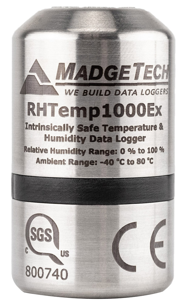 MadgeTech RHTemp1000Ex Humidity and Temperature Data Logger is compact and carries hazardous-location and intrinsically-safe global certification (ATEX, IECEx, FM 3610).