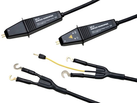 Straight duplex hand spikes with spring loaded tips. One probe has LEDs that operate with the DLRO10 for connection indication and live warning. The DLRO10X can indicate test limit pass/fail. Spacing between P and C probe tips is 0.23 in. (6 mm).
