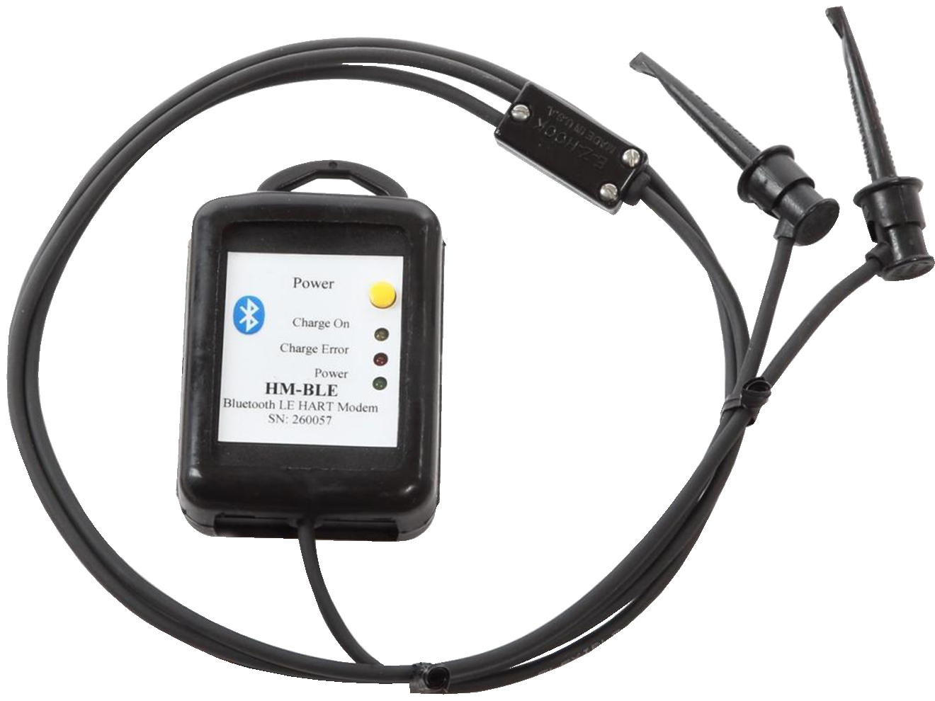 The HM-BLE features an internal antenna, a rechargeable Li-Ion battery with up to 100 hours of continuous use, and rugged construction including a heavy-duty ABS enclosure with a rubber boot for durability in industrial environments. It includes integral mini-grabber connectors, a micro-USB charging port, and a built-in loop for strap attachment. The modem complies with HART Physical Layer Spec HCF_SPEC-54 and supports HART versions 4 through 7. It is compatible with DevComDroid and DevCom.iOS software for seamless mobile operation.